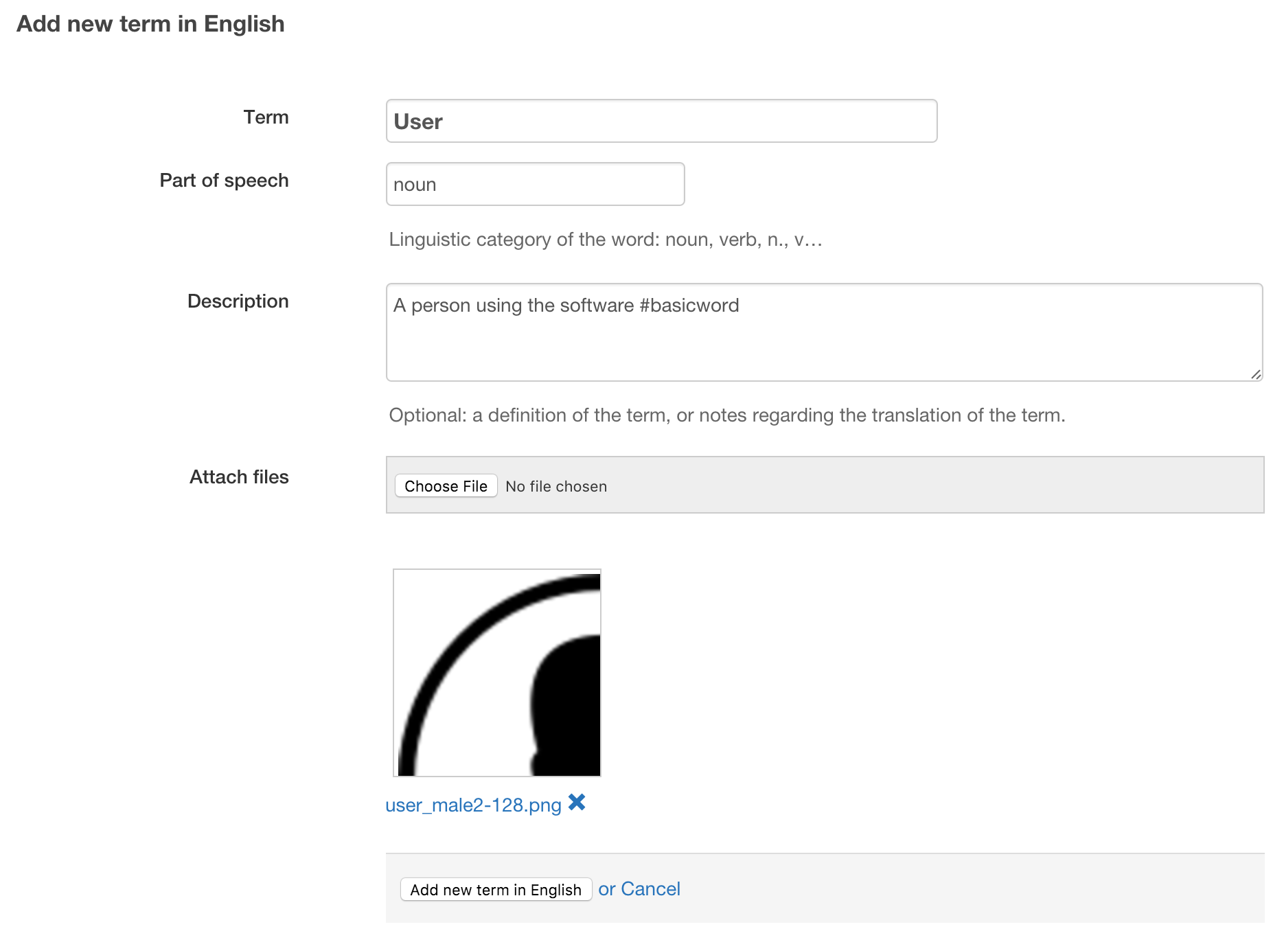 Enter the term name (mandatory), part of speech (optional) and description (optional). You can use #hashtags in the description, which are useful to categorize terms if you have many. You can also attach an image or file to the term. It can help translators understand the meaning of a concept more easily.